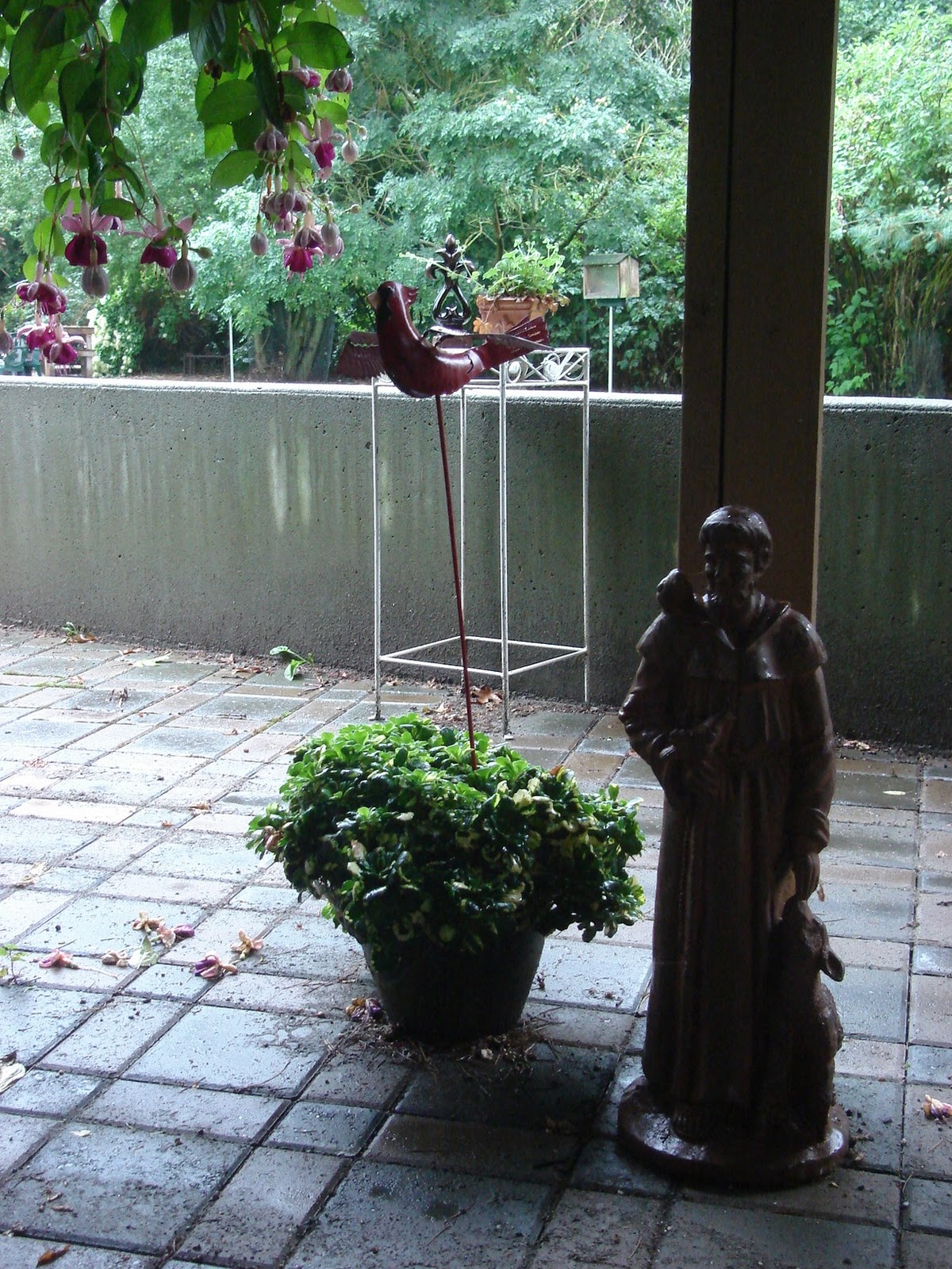 I did not see any predator making off with a domestic fowl in its maw, but I did notice (a) how well the veronica is growing as a groundcover and (b) that a few weeds were sticking up out of the veronica. So I started to pull a few and went up the stairs pulling weeds for a while. Then I remembered I was going to make supper, so I went back in the house.